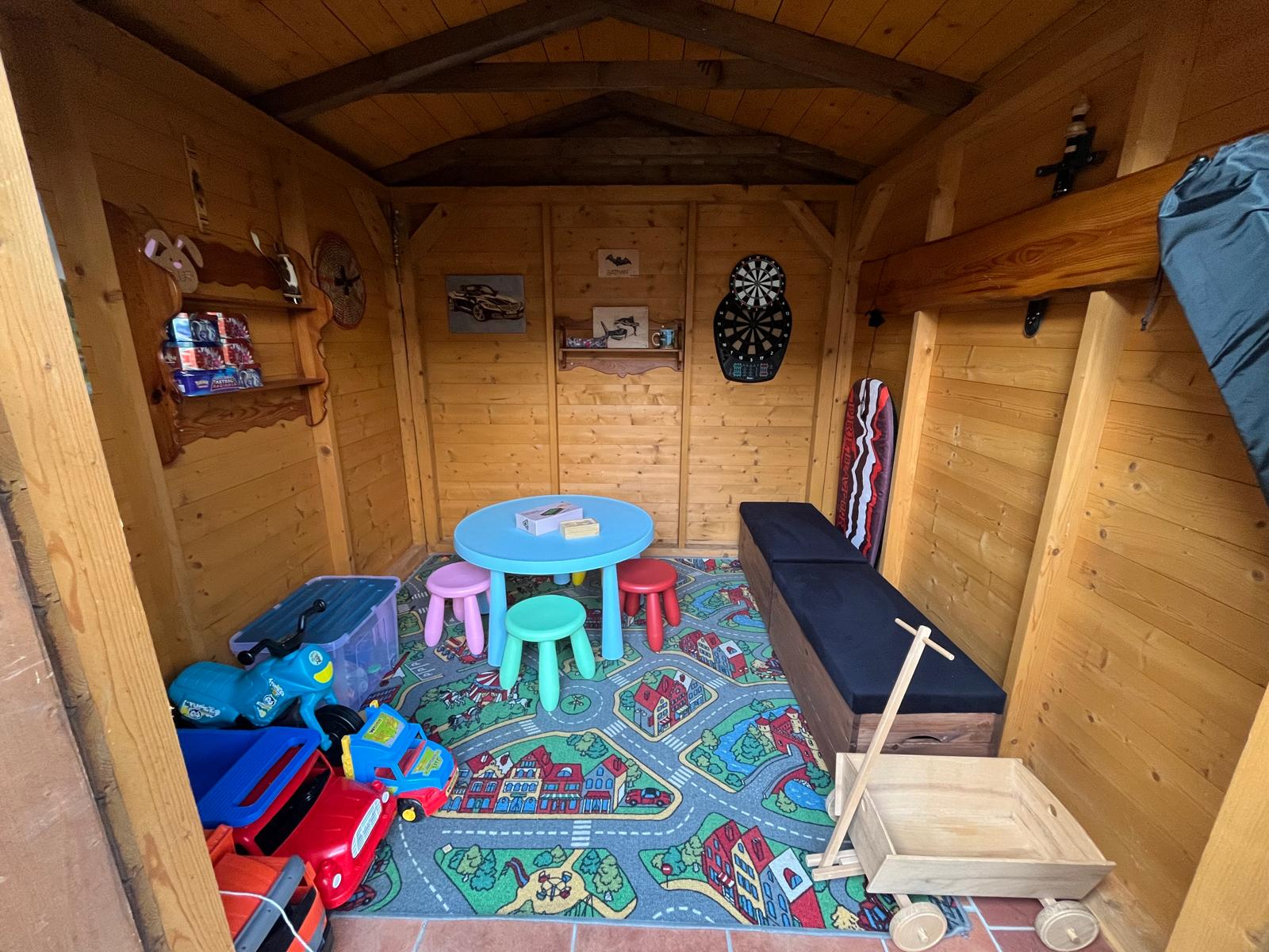 Ve všech částech domu jsou k dispozici dostatečné úložné prostory. Ve sklepní části objektu se nachází herna vybavená šipkami, herní konzolí a stolním tenisem.